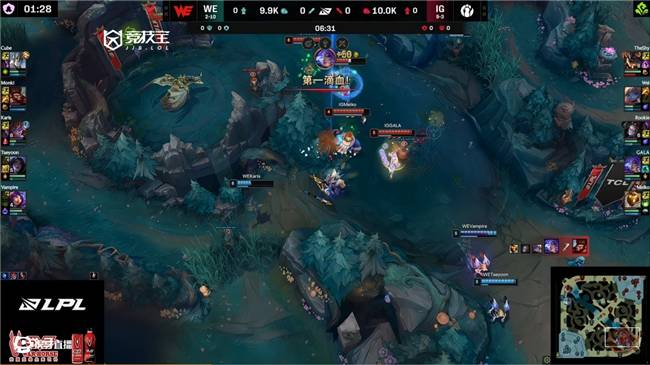 次局比赛,WE在蓝色方,IG在红色方。阵容方面,WE点出了掘墓、潘森、岩雀、烬、泰坦,IG则是拿到大虫子、巨魔、阿狸、飞机、芮尔。开局对线期双方依然是火药味十足,3分钟时两队就在河道爆发第一波团战,rookie的阿狸率先击杀Vampire泰坦拿到一血,但WE凭借人数优势接连追死巨魔和芮尔最终打出1换2。10分钟,双方野区爆发混战,WE打出一波惨烈的2换3。前期双方总体经济基本持平。